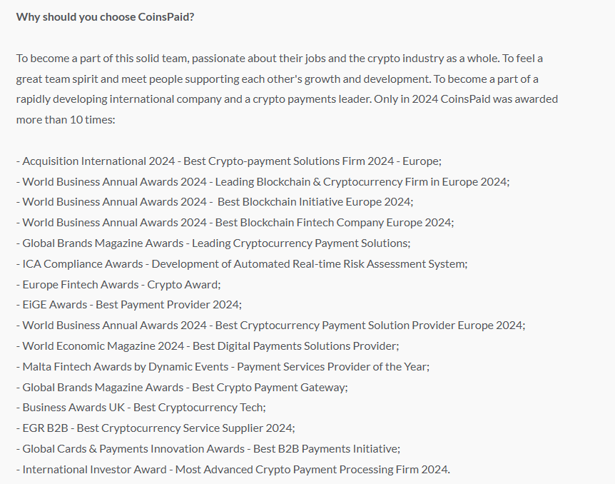 They also have a decent sized trophy cabinet when it comes to “Why Choose” CoinsPaid as an employer 👇