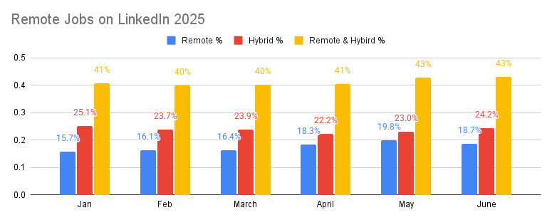 19% of jobs listed are remote, 24% are hybrid which = a total of 43% of jobs are flexible - and that has been consistent over the last quarter.