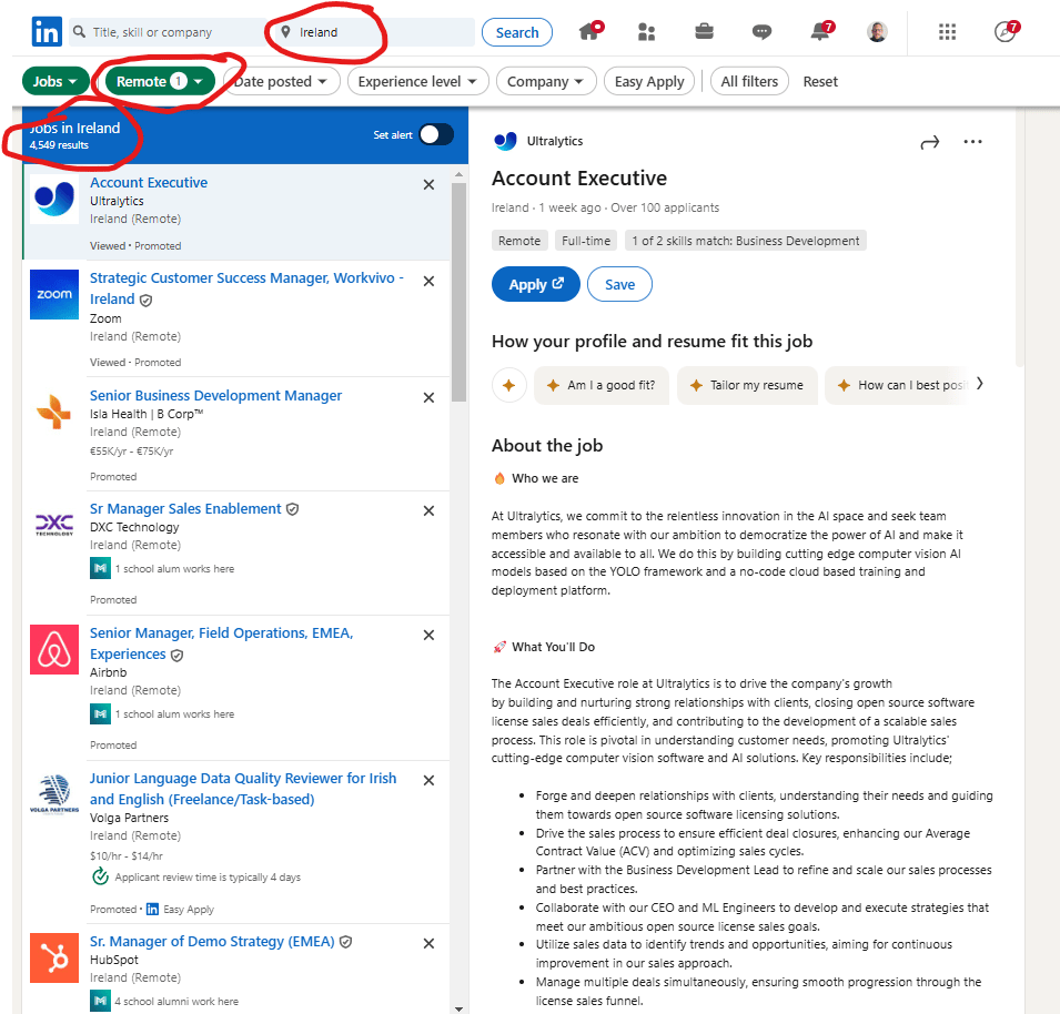 Top Tip - Make sure that you use the filters to define the country “Ireland” and location as “Remote”. Important - because LinkedIn is “scraping” some of the non paid listings from the careers pages of employers there are some non remote jobs that sneak their way into the listings. You will need to check out the company & the actual job listing to validate it!